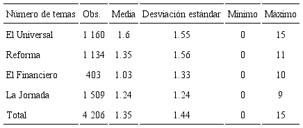 Se construyó una variable que suma el número de temas mencionados en cada nota. El rango de esta variable va de 0 a 15 temas y la media de temas por nota es de apenas 1.35 temas con una desviación estándar de 1.44. La media de temas por nota es bastante similar en todos los periódicos analizados. Destaca el periódico El Universal, el cual tiene la media más alta de temas por nota con casi dos temas por nota (cuadro 5).