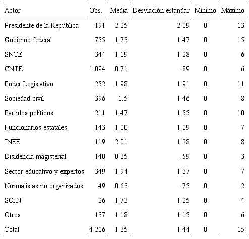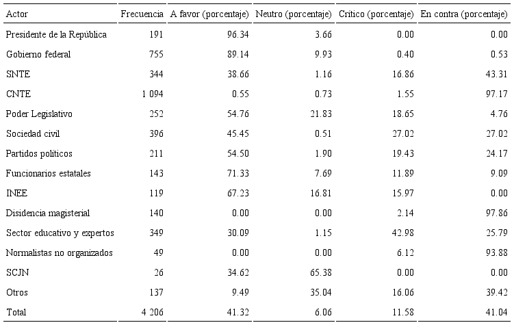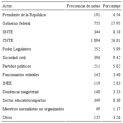 Se encontraron 14 categorías de actores presentes en la cobertura. El actor que tuvo mayor presencia en los periódicos analizados fue la CNTE con 26 por ciento de las notas, seguido del gobierno federal con 17.95 por ciento de las notas. La sociedad civil, que es una categoría amplia donde se agrupan empresarios, iglesias, organizaciones de la sociedad civil, entre otras, recibió 9.4 por ciento de la cobertura. Es importante destacar que actores como los maestros normalistas no organizados, la Suprema Corte de Justicia de la Nación, los funcionarios estatales y el INEE fueron los actores que recibieron una cobertura marginal (cuadro 6).