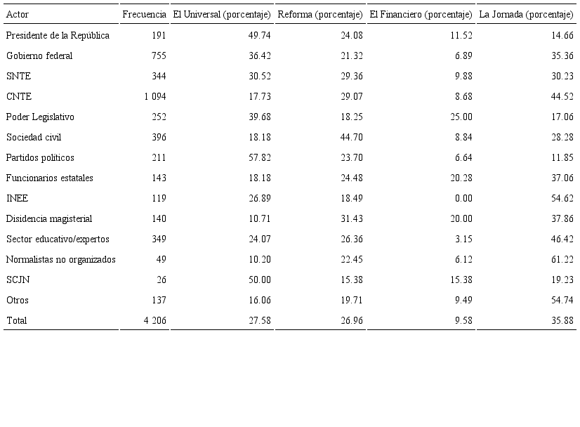 Se encontraron diferencias importantes en la presencia de los actores de la RE por periódico analizado. Por un lado, destaca que las notas donde el presidente de la República, el Poder Legislativo, los partidos políticos y la Suprema Corte de Justicia de la Nación fueron los actores principales, estuvieron concentradas en el periódico El Universal. Por otro lado, aquellas notas donde la CNTE, la sociedad civil, los funcionarios estatales, el INEE, la disidencia magisterial, el sector educativo y expertos y los maestros normalistas no organizados fueron el actor principal, estuvieron concentradas en el periódico La Jornada. Destaca el caso del SNTE y el gobierno federal que lograron permear de forma indistinta todos los medios analizados (cuadro 7).