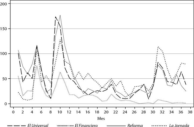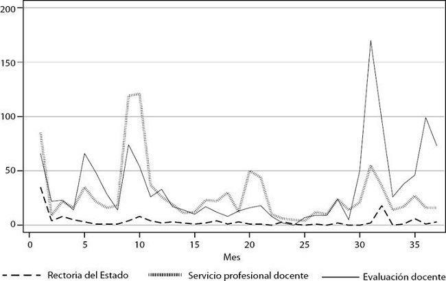 Los meses en los que la RE recibió mayor cobertura fueron abril, agosto y septiembre de 2013 (meses 5, 9 y 10 en la gráfica 1), que coinciden con la aprobación de las tres leyes secundarias, la resistencia de la Coordinadora Nacional de Trabajadores de la Educación y el surgimiento del Movimiento Popular Guerrerense (MPG).