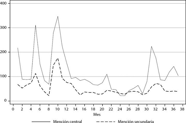 La tendencia entre menciones secundarias y menciones centrales sigue un mismo patrón de cobertura (gráfica 2).