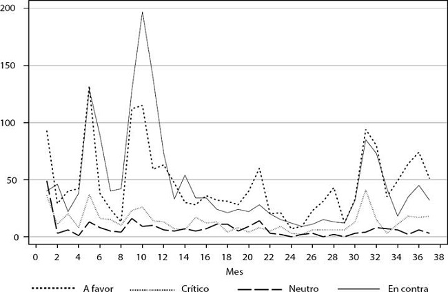 El número de notas con una postura en contra de la reforma registran mayores niveles cuando se presentan las principales manifestaciones de resistencia a la aprobación de las leyes secundarias y cuando tienen lugar decisiones y acciones políticas de alto impacto. Destaca que los meses en los que la RE recibió una mayor cobertura coinciden con el momento en que se presentan manifestaciones directas del conflicto.