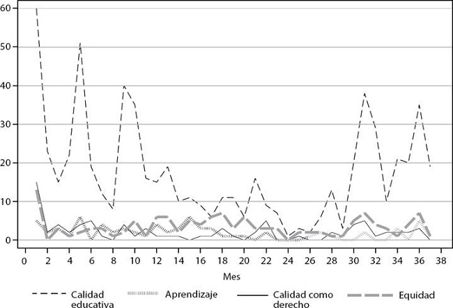 La calidad educativa fue uno de los temas que aparecieron con mayor frecuencia en las notas analizadas (15.5% del total de notas), aunque las menciones son significativamente menores que las menciones a la evaluación docente o al servicio profesional docente. Sin embargo, destaca que las menciones a la calidad como derecho son marginales (1.9%), siendo éste uno de los aspectos más importantes que fueron reformados y que justifican gran parte de las otras modificaciones introducidas. Las menciones al aprendizaje y la equidad también fueron marginales (1.66 y 3.04%, respectivamente) (véase gráfica 4).