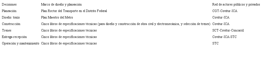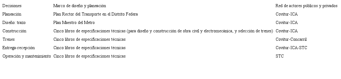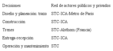 En términos del proceso de formación de las decisiones para la construcción de la red del Metro (diagrama 1) se establece una particular interacción entre actores públicos y privados, tanto nacionales como internacionales, en torno a la gestión del proyecto; véase la configuración en el cuadro 1.