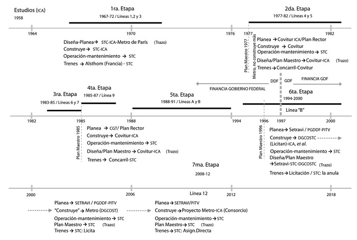 Las fases de toma de decisiones e implementación serán abordadas en este ensayo en una amplia temporalidad, con la intención de caracterizar para las primeras once líneas el modo en que se institucionalizó ese complejo proceso ingenieril: diseño, construcción y funcionamiento eficaz de una línea de Metro.