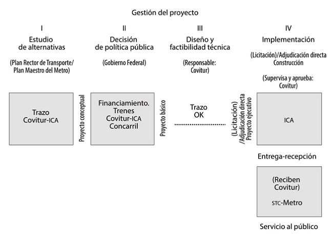 La dinámica que conjunta los anteriores factores se deriva de la presencia de Covitur como nuevo actor en la toma de decisiones.11 Ejercerá una intermediación o triangulación entre el STC -que ya sólo opera y da mantenimiento- y el contratista o constructor (ICA). Este organismo público desconcentrado asumirá las difíciles y complejas funciones de la gestión de proyectos, de modo que es su responsabilidad contratar el proyecto básico (diagrama 3, fase II), indispensable para licitar (o adjudicar directamente) el proyecto ejecutivo (diagrama 3, fase III). A continuación, Covitur deberá licitar (o adjudicar directamente) la construcción de la obra civil y electromecánica (diagrama 3, fase IV). En esta secuencia, deberá asumir la supervisión de la construcción y sancionarla: que la obra civil y electromecánica se haga conforme a los proyectos ejecutivos. Y finalmente, Covitur deberá recibir de ICA la línea de Metro funcionando de acuerdo con las diversas normas (seguridad, comunicación, interface rueda-riel, etcétera) y, a su vez, hacer la entrega formal de la misma al STC-Metro.