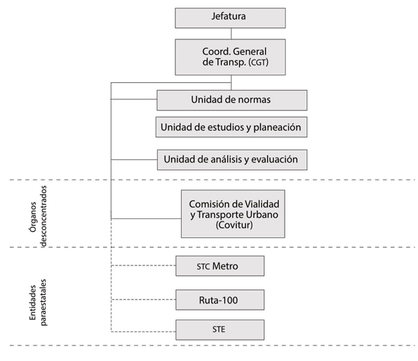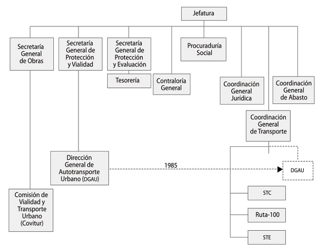 El cambio de régimen político -transformación del DDF en GDF- produce igualmente un considerable ajuste legal y organizativo en el nuevo GDF con la Ley Orgánica de la Administración Pública del Distrito Federal (LOAPDF) de 1998, misma que también reestructura el sector del transporte, dejando atrás el incipiente esfuerzo a favor de la coordinación metropolitana (Umaña, 2001). En el desarrollo de ese proceso, los asuntos de transporte dejarán de abordarse desde una “coordinación” (CGT) y pasarán a ser materia de una Secretaría de Transporte y Vialidad (Setravi) a partir de 1994. Complementariamente, la poderosa Covitur, órgano desconcentrado de la Secretaría de Obras, se transformará nominalmente en Dirección General de Construcción de Obras del Sistema de Transporte Colectivo adscrita a la misma secretaría. Por último, se actualizará en 1995 la Ley de Transporte del Distrito Federal, que no se había reformado durante medio siglo, desde 1942 (Arellano et al., 2002).