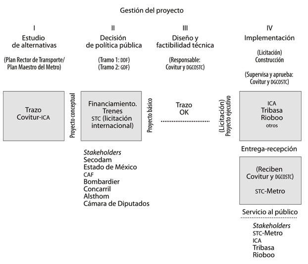 ICA desarrolló el proyecto conceptual (diagrama 2, fase I) asesorada por empresas privadas de Francia (Alsthom,4 entre las principales) (Moreno, 2013: 9-11) y por el Metro de París.5 En la perspectiva de la gestión integral, el proyecto conceptual es el punto de partida técnico para abrir el debate sobre la prefactibilidad de la obra (Hernández Chárraga, 1996), y en el caso de una línea de Metro se extrae de los estudios de demanda la propuesta de los trazos de una naciente red de Metro.
