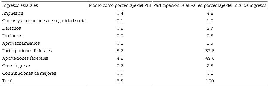 Esta debilidad del esfuerzo fiscal se identifica analizando la estructura de los ingresos totales de las entidades federativas en términos agregados. Como se muestra en el cuadro 1, los ingresos estatales ascienden a 8.5 por ciento del PIB; cifra que, en términos desagregados, se compone de 87.2 por ciento de ingresos provenientes de transferencias (participaciones y aportaciones federales), y apenas 4.8 por ciento de recaudación de impuestos.