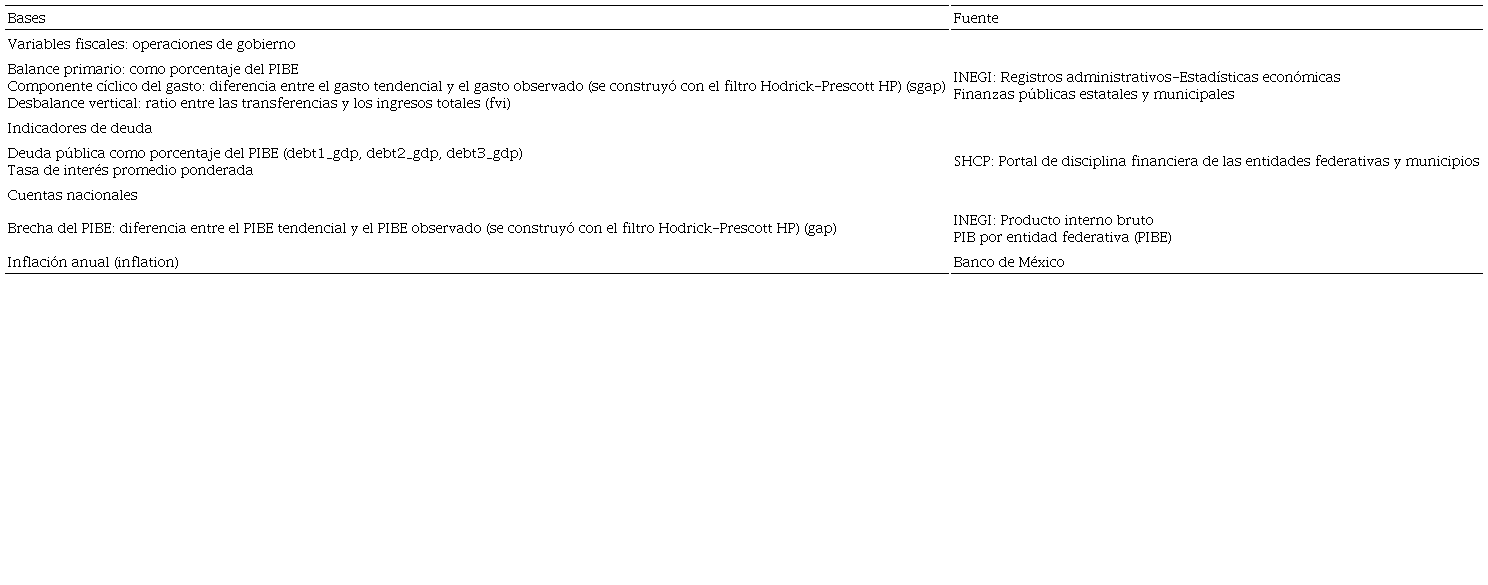 La estrategia metodológica consiste, entonces, en estimar la función cúbica de la deuda rezagada en la ecuación 4 e igualarla en 5 para obtener los límites de la deuda d. Para este trabajo, esto se realiza, en primera instancia, a través de un modelo de regresión tipo panel con efectos fijos, para después utilizar los coeficientes obtenidos y, así, calcular los límites de deuda de las entidades federativas usando la ecuación 5.