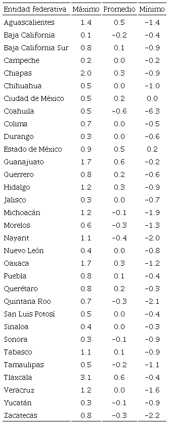 El cuadro 4 muestra los valores máximos, el promedio y el mínimo de los espacios fiscales registrados por cada entidad federativa durante el periodo analizado. Para más detalle, en el anexo 1 se presenta la evolución del espacio fiscal y la deuda pública por entidad federativa.