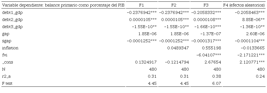 En los tres modelos estimados, los coeficientes de la deuda pública son significativos a 99, 95 y 90 por ciento de confianza según la etapa en que se encuentre la deuda pública. En debt1 -con signo negativo- y debt2 -con signo positivo, pero con coeficientes bajos- la significancia siempre es a 99 por ciento de confianza. En debt3 -con signo negativo, pero, de igual forma, con los coeficientes bajos- la significancia en F1, F2 y F4 es a 95 por ciento de confianza; mientras que en F3 el coeficiente es significativo a 99 por ciento de confianza. El poder explicativo de los modelos estimados (r2_a) en F1 y F2 es de 31 por ciento, mejorando a 38 por ciento en F3 una vez incorporadas todas las variables de control, y empeorando a 24 por ciento en la estimación del modelo por efectos aleatorios en F4. Otras variables significativas que destacan son el componente cíclico del gasto público estatal, cuyo coeficiente, si bien es bajo, muestra una reacción negativa del balance primario a 99 por ciento de confianza en todos los modelos estimados; y el desbalance vertical, cuyos coeficientes en F3 y F4 son altos y significativos a 99 por ciento de confianza.