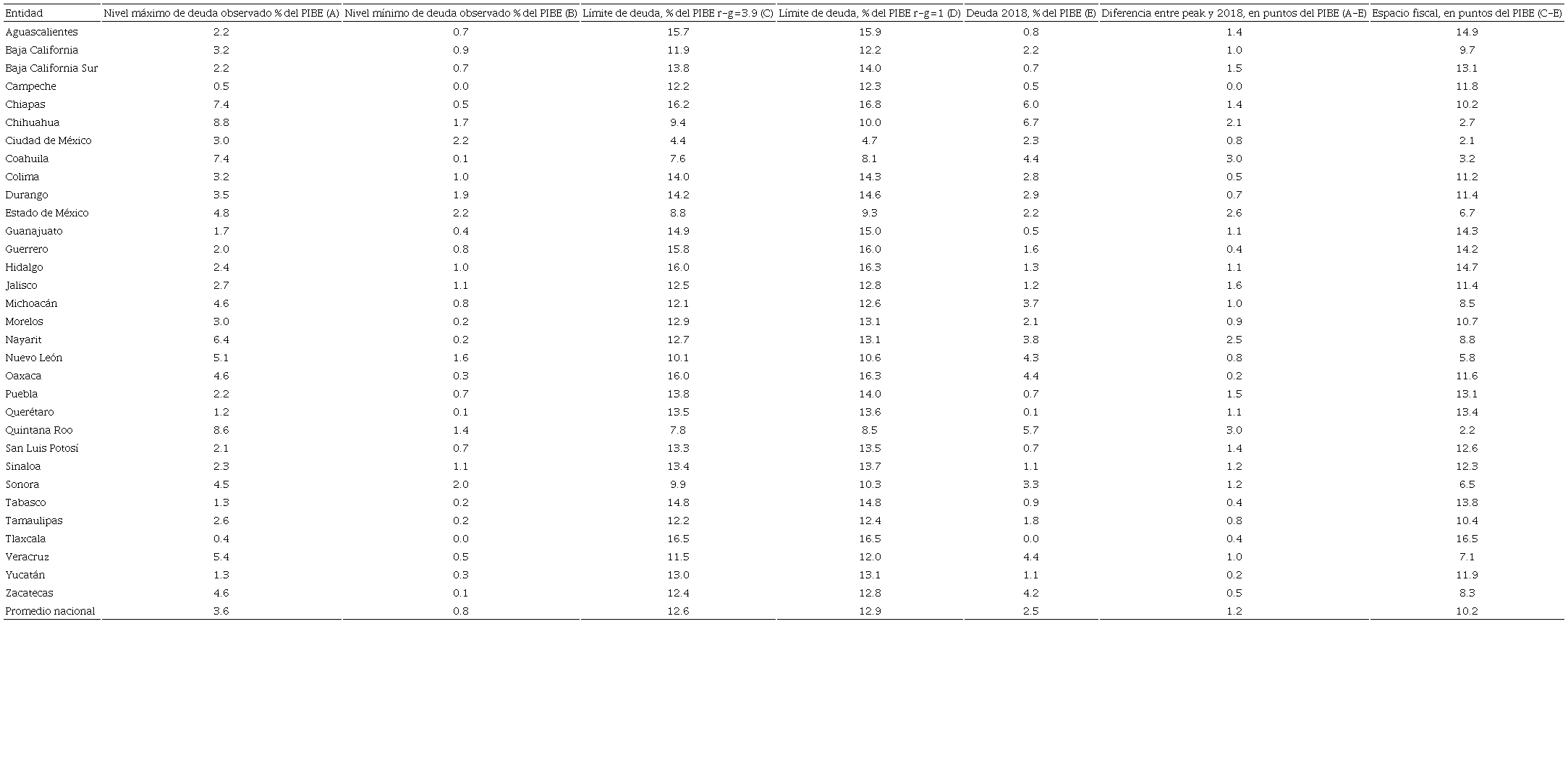 Sin embargo, en términos de deuda pública estatal, los resultados evidencian que aún existe espacio fiscal en todos los gobiernos estatales, dado que el nivel de deuda alcanzado en términos del PIBE, en 2018, en todas las entidades federativas, se encuentra por debajo de los límites de deuda estimados, y a partir de los cuales los gobiernos caerían en niveles de insostenibilidad. Destacan, no obstante, las amplias diferencias de espacio fiscal que existen entre los estados, característica que evidencia las desigualdades presentes en cuanto a presiones de gasto, de capacidades institucionales y de gestión del financiamiento para las políticas públicas locales.