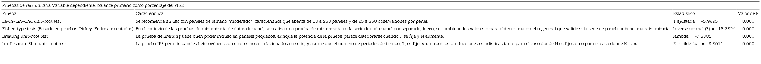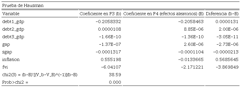 Dado que el mayor poder explicativo se logró en F3, se estimó el modelo de efectos aleatorios en F4 con la finalidad de observar si las diferencias entre ambos modelos eran sistemáticas. Para ello, se realizó la prueba de Hausman, rechazándose la hipótesis nula de que no existen diferencias entre ambos modelos, tal como lo muestran los resultados en el anexo 2a, donde se sugiere el uso del método de efectos fijos. Aunado a ello, se realizó la prueba de Wooldrige en F3, prueba cuyo resultado, mostrado en el anexo 2b, no permite rechazar la hipótesis nula de autocorrelación de primer orden. Finalmente, se realizaron cuatro pruebas de raíz unitaria distintas, cuyos resultados, en el anexo 2c, coinciden en rechazar la presencia de raíces unitarias en los paneles, validando con ello la estacionalidad de estos.