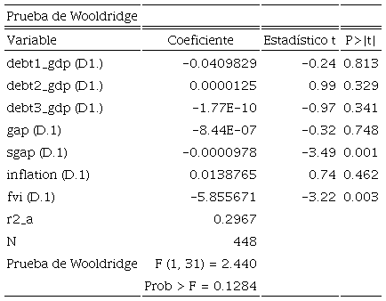 Como ya se anticipaba, para el cálculo de los coeficientes necesarios para obtener los límites de deuda por entidad federativa d en la ecuación 5, antes, se estima un mode lo de regresión tipo panel con efectos fijos, en donde, de acuerdo con la ecuación 6, la variable dependiente Sit es el balance primario medido como porcentaje del producto interno bruto estatal en la entidad i, en el año t. Las variables dicotómicas para cada entidad federativa se expresan en αi ; las variables explicativas de interés son la deuda pública como porcentaje del PIBE con rezago en debt1, al cuadrado en debt2, y al cubo en debt3. Al modelo se agregan las siguientes variables explicativas que, de acuerdo con la literatura, explicarían el comportamiento de los balances primarios: la brecha del producto interno bruto estatal gapit , el componente cíclico del gasto público calculado como la brecha del gasto público sgapit , la inflación inflationit y el desbalance vertical medido como la ratio entre las transferencias (participaciones y aportaciones) y los ingresos totales de los gobiernos estatales fviit (Bastos y Pineda, 2013; Mendoza y Ostry, 2008). Los términos de error se indican en eit .