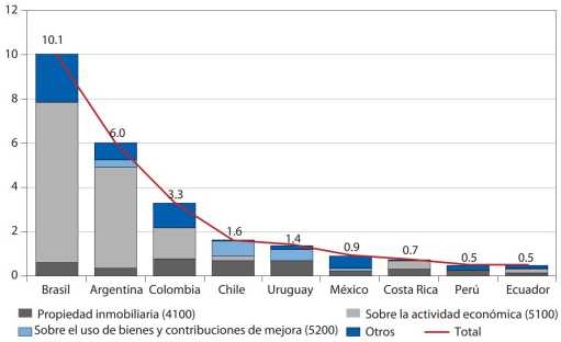 En este sentido, la gráfica 1 muestra los pobres niveles de recaudación de impuestos de los gobiernos subnacionales en México. En relación con el porcentaje del pib, los ingresos tributarios se ubican por debajo de 1 por ciento, cifra que es considerablemente inferior a lo logrado en Brasil (10.1%), Argentina (6%), Colombia (3.3%), Chile (1.6%) y Uruguay (1.4%).