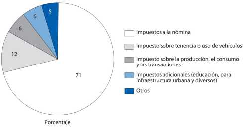 Del total de los ingresos tributarios, más de 71 por ciento se origina en la recaudación del impuesto a la nómina; siguiendo en orden de importancia los ingresos del impuesto sobre la tenencia o uso de vehículo, cuya participación porcentual es de 12 por ciento del total de los ingresos tributarios estatales.