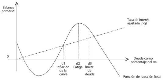 De acuerdo con la restricción presupuestaria del gobierno, la intersección entre la función del balance primario y la diferencia entre la tasa de interés real (r) y la tasa de crecimiento de la economía en un periodo definido (g) determina el límite de la deuda pública; en una condición de equilibrio en la cual los niveles de deuda se estabilizan, tal como se expresa a continuación: