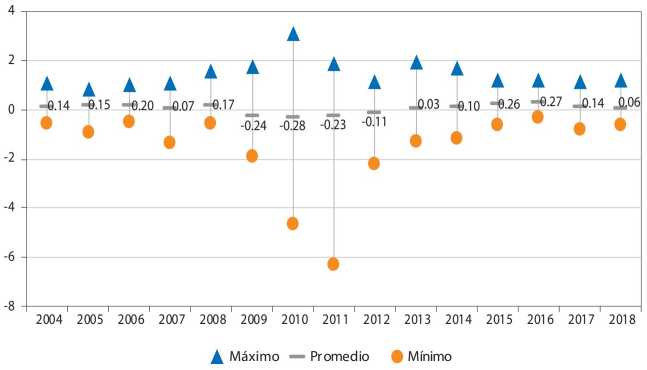 Los niveles máximos de espacio fiscal disponible fueron de alrededor de 1.5 por ciento del PIBE; mientras que los niveles mínimos de espacio fiscal -siempre requeridos (-)- fueron, en promedio, de alrededor de -1.6 por ciento del PIBE. Destaca que, justamente en los años en los que el espacio fiscal promedio de las 32 entidades federativas resultó negativo, fue cuando las brechas entre los niveles máximos y mínimos alcanzaron su punto más alto. En efecto, la gráfica 3 evidencia que las disparidades de las cuentas fiscales entre entidades federativas aumentaron en el periodo 2010-2012.