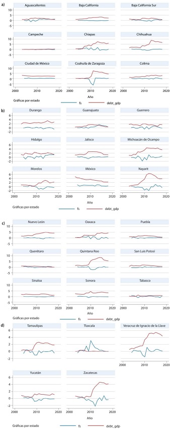 Entidades federativas: evolución del espacio fiscal en términos de la disponibilidad del balance primario (fs) y la deuda pública estatal (debt_gdp), como porcentaje del PIBE.