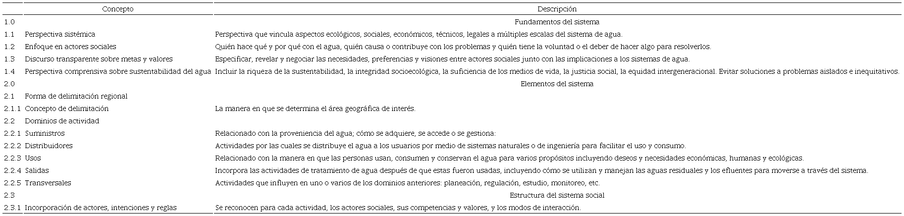Partimos de la premisa que la LAN procura la integración de las fuentes del recurso hídrico y la sociedad a través de un conjunto de normas que rigen las interacciones entre los distintos elementos involucrados. Por lo tanto, presumimos que la LAN anuncia un sistema sociohidrológico. Con una visión de simplificar las complejidades del SSH que presenta la gestión del recurso hídrico en cualquier territorio, se utilizó como base el documento de Wiek y Larson (2012), el cual descompone el complejo en un sistema de entradas y salidas con una relativa sencillez que facilita la identificación de los elementos nucleares de un sistema, además de incentivar la integración de los actores sociales. En el cuadro 1 se observan los elementos utilizados para la evaluación del enfoque sistémico aplicados a la LAN. Para esto, se seleccionaron y adaptaron tres de los componentes de la metodología de propuesta: fundamentos del sistema, elementos del sistema y estructura del sistema social.