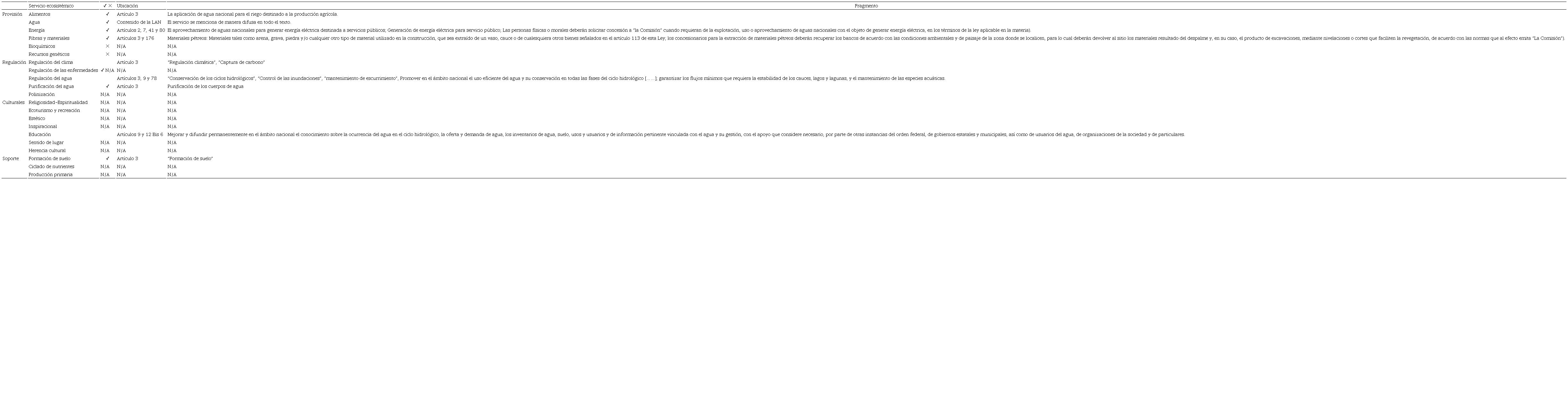 El resto de los servicios mencionados representa servicios de regulación que prestan otros ecosistemas. Aunque se presume la necesidad de conservar múltiples servicios ecosistémicos, estos se conservan mediante la gestión adecuada de los ecosistemas que los proveen y no únicamente mediante el cuidado de la cantidad y calidad del agua. Con el supuesto de poder encontrar servicios implícitos en el texto, se encontraron algunas menciones no reconocidas como servicios ecosistémicos, pero que conceptualmente y a través de interpretación reconocen la importancia de los ecosistemas acuáticos, por ejemplo el caso de los recursos pétreos correspondientes a los materiales de construcción. Pese a que se pueden encontrar algunos servicios implícitos y se han mencionado otros servicios directamente en el texto, la diversidad de servicios que se conjugan con el agua es menor a la que la literatura reconoce (véase MEA, 2005; Haines-Young y Potschin, 2017). Además, solo se reconocen los servicios de regulación, desconociendo la pluralidad de valores socioculturales y económicos que los ecosistemas asociados al agua pueden proveer. Con base en la presente investigación, podemos decir que el concepto de SE no tiene mayor relevancia en el cuerpo del documento, ni en ninguno de los procesos de gestión, sanción o planeación.