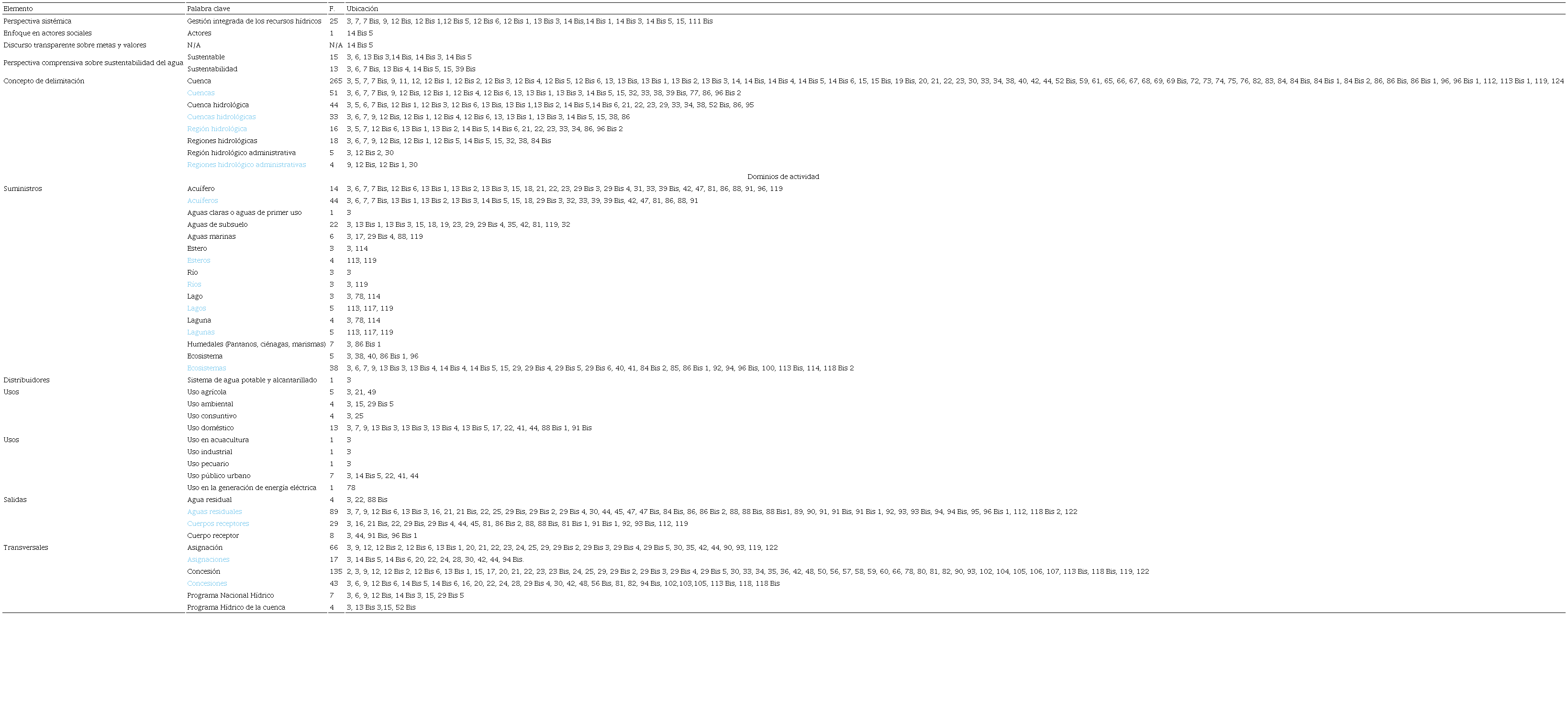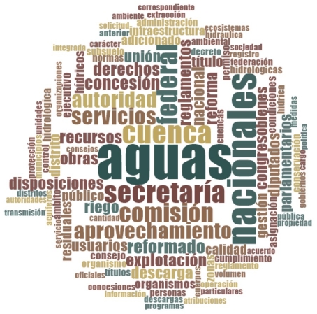 En general, la LAN se centra en el manejo y la regulación del acceso al agua. La nube de palabras (figura 1), acerca del contenido de la ley, no refleja los componentes sociales y ecológicos del funcionamiento del sistema sociohidrológico. Más bien, en primera instancia se observan las escalas de gestión de agua, desde el concepto geográfico de cuenca y la organización político-administrativa, la cual considera la representatividad de la ley a la escala nacional. Lo que se presenta a continuación consiste en un esfuerzo de profundizar en la abstracción del sistema sociohidrológico planteado en la LAN para analizar el grado de integración de conceptos tan comúnmente utilizados en el lenguaje del manejo de recursos naturales.