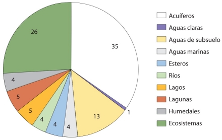Existen elementos fuente (suministradores) descritos como ecosistemas acuáticos que aunque son bienes nacionales, pueden concesionarse o asignarse a un particular. Esta agua se utiliza de diferentes formas mediante un sistema de agua potable y alcantarillado encargado de distribuir el agua a los usuarios. El producto de los usos del recurso son las salidas o aguas residuales y todos interactúan mediante instrumentos que regulan la intensidad del uso del agua, de las características del sistema de distribución y los parámetros fisicoquímicos de las aguas. No obstante, Wiek y Larson (2012) no incluyen en este modelo la diversidad de usuarios, por ejemplo, no todos los usuarios del uso agrícola producen las mismas salidas, ya que estas dependen de las prácticas agrícolas. Por lo tanto, el modelo aquí provisto no demuestra una complejidad; al contrario, es lineal pero de gran utilidad para identificar los componentes fundamentales del sistema de distribución. Al respecto, la gráfica 2 muestra diez conceptos asociados al dominio de los suministros o suministradores. Los acuíferos destacan con un 35 por ciento del total de presencia de los tipos de suministradores.
