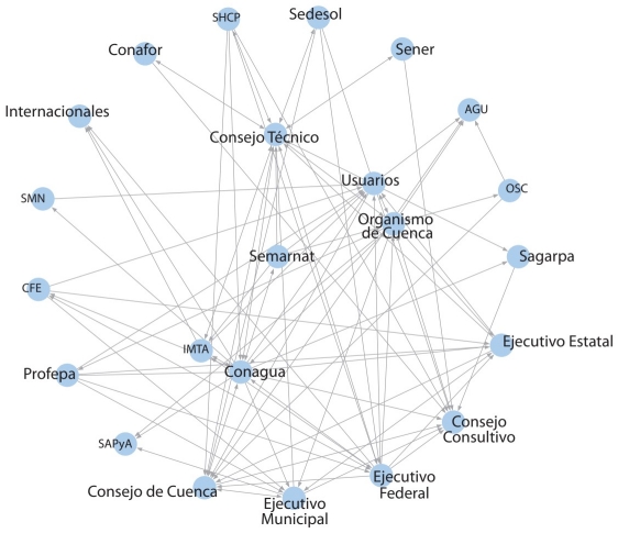Los principales actores son la Conagua, el Ejecutivo Federal, los gobiernos estatales y municipales, el Consejo Consultivo y el Organismo de Cuenca. Todos estos intervienen en la toma de decisiones, soportada por la información que obtienen de “instituciones secundarias” que no necesariamente son inferiores en jerarquía a la Conagua, pero que cumplen el papel de soporte con la información que generan, por ejemplo, la Comisión Nacional Forestal (Conafor) y el Instituto Mexicano de Tecnología del Agua (IMTA). Los usuarios y la sociedad civil se relegan a tener representantes en los consejos de cuenca. En estos, junto con la participación de los representantes de los gobiernos y de la Conagua, se generan propuestas de gestión a la escala de cuenca. Esta situación genera una arquitectura de gobernanza que refleja cierto policentrismo, pero donde el poder se distribuye heterogéneamente entre los actores. Aunado a esto, el papel de la Conagua aparece con tanta importancia que potencialmente aparece como un actor absoluto en la gestión del agua, el cual vehicula la priorización de los intereses gubernamentales en la gestión de los recursos hídricos.