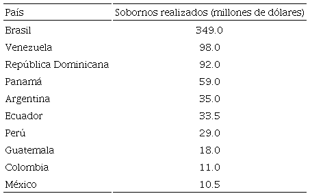 A continuación, el cuadro 1 presenta un estimado de las cifras que se produjeron para el soborno o pagos a funcionarios corruptos y partidos políticos en los países latinoamericanos. Se puede observar como Brasil destaca con una enorme cifra que casi alcanza los 350 millones de dólares, seguida por Venezuela que casi llega a los 100 millones de dólares y que en general se producen en los principales países y mercados comerciales de América Latina como República Dominicana, Panamá, Argentina, Ecuador, Perú, Guatemala, Colombia y México.