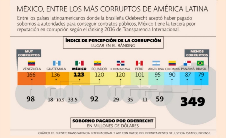Curiosamente, aun con la crisis política brasileña vivida entre 2015 y 2016, y con la enorme cantidad de pagos en sobornos, se le percibe como la menos corrupta dentro de este ranking, y si se le ubica en la gráfica 1 se encuentra en quinto lugar como la menos corrupta de la región. Es un dato que hay que tener en cuenta dentro de los cambios políticos que ha sufrido Brasil y en la incorporación del presidente Temer dentro de esta dinámica.
