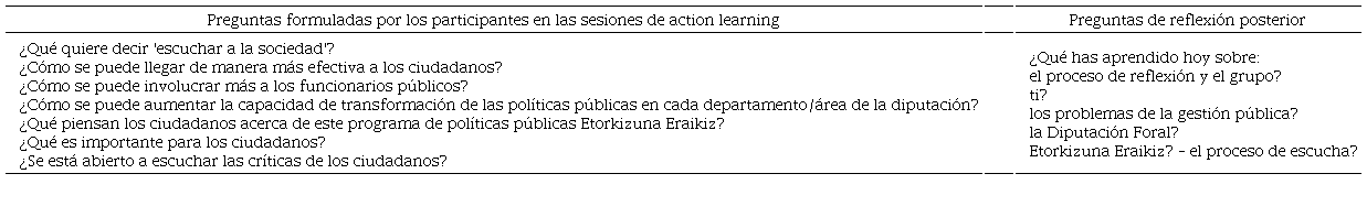 Los datos revelan características propias de la metodología de aprendizaje empleada: para aprender es necesario partir de que no se sabe, y ayudar a avanzar planteando buenas preguntas (Revans, 1998). Así, al inicio del proceso, los participantes se hacen conscientes de la importancia de aprender a formular las preguntas adecuadas y documentar la visión compartida por cada uno frente a las cuestiones expuestas. Se siente que se aprende con y de los demás, para lo que hay que “prestar atención, fortalecer la capacidad de escucha y activar la interacción”, según expresó un participante.