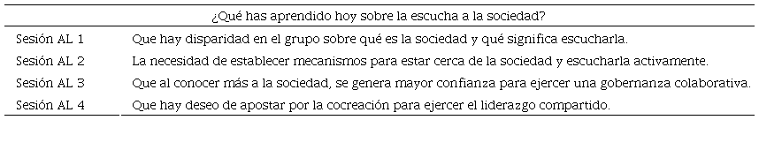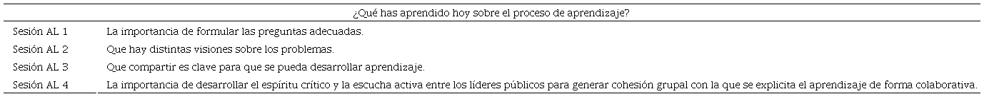 El avance de las sesiones evidenció una mayor conciencia de la necesidad de reservar tiempo al proceso de aprendizaje, tanto individual como colectivo, así como de la importancia de adoptar una actitud abierta al aprendizaje. Es un contenido recurrente en las respuestas de los participantes la necesidad de mantener estos procesos en el tiempo y de dotar de herramientas a los líderes públicos en los ámbitos personal, colectivo y organizacional.