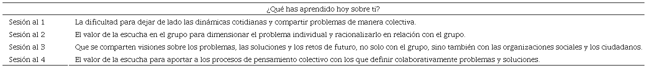 En la última sesión del proceso se evidencia que los participantes han fortalecido el espíritu crítico y la escucha activa entre pares, generando confianza y cohesión: “Ha sido un grupo de aprendizaje diverso, con distintas visiones, muy plural, pero con un importante nivel de autoreconocimiento como grupo, y esto ha generado un importante nivel de cohesión grupal”. Otra persona afirma: “Soy más consciente ahora de que soy más capaz de actuar de otra manera tras este proceso. Me ha servido para cohesionarme de un modo distinto con el grupo”.