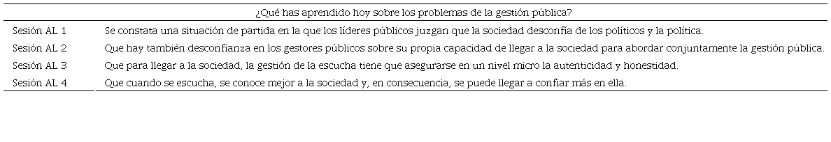 Al comienzo del proceso de aprendizaje los participantes constatan que se desconfía de la capacidad de la sociedad de responder e implicarse en la gobernanza colaborativa que se quiere llevar a cabo: “La sociedad está alejada de la política”; “la sociedad es muy exigente” “la sociedad no quiere participar”. Pero se constata desconfianza también en los líderes públicos hacia su propia capacidad de llegar a la sociedad: “No sabemos realmente hacia dónde va la sociedad, o mejor dicho, dónde encontrarnos con ella”. Incluso uno llegó a escribir: “No llegamos a la sociedad, no conectamos y no acompañamos en la evolución. ¿Qué hacemos?”