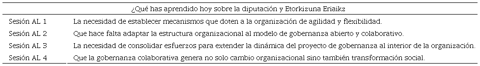 Los datos reflejan que el aprendizaje de los participantes evoluciona de una fase inicial, en la que se constatan deficiencias de la propia organización, a una fase final, en la que hay mayor confianza en la capacidad del modelo de gobernanza que se pretende desarrollar. Así, las respuestas de la primera sesión diagnostican una Diputación Foral que adolece de estructura antigua, diseñada en 1980. Según lo informado por los participantes: “La diputación es una organización profesional y madura pero necesita establecer mecanismos que le doten de agilidad y flexibilidad para adaptarse a los cambios que se generan en la actualidad y que vendrán en el futuro”. Se observa la dificultad al interior de la organización para modernizar la propia estructura y dar el salto necesario.