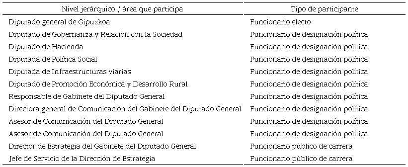 Por lo tanto, el despliegue de este proceso al interior de la Diputación Foral de Gipuzkoa se inició con la configuración de un grupo de action learning (AL) conformado por los doce responsables políticos (la mayor parte funcionarios electos y dos funcionarios públicos de carrera) que componen el equipo de gobierno provincial y, por lo tanto, con la máxima responsabilidad deliberativa y de decisión. El anexo 1 detalla las características de los miembros del grupo.
