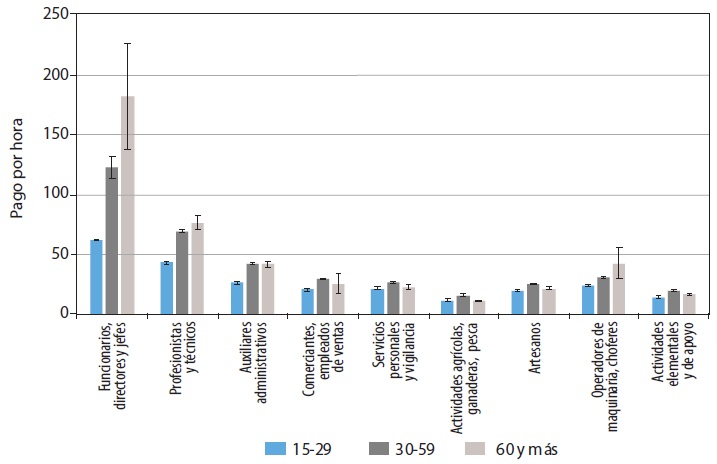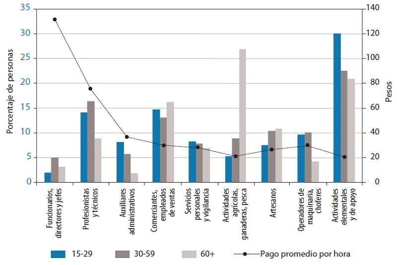 Se podría argumentar que los mayores no tienen los ingresos laborales más altos que los adultos porque la productividad decae con la edad. Esto implicaría, primero, aceptar que la experiencia y la productividad no necesariamente van juntas. Por otro lado, las categorías donde los mayores ganan más que los adultos son categorías donde la productividad es un factor altamente valorado: funcionarios, directivos y jefes; profesionistas y técnicos; y operadores de maquinaria industrial, ensambladores, choferes y conductores de transporte. Para que la justificación de la experiencia se sostenga, se tendría que aceptar que el mercado recompensa a los mayores en estos ámbitos con salarios más altos aunque sean menos productivos. Aquí los criterios dejan de ser justos para los jóvenes que simplemente no pueden competir con los otros grupos etarios.