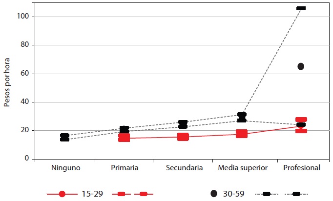 Además de la concentración desproporcionada, dentro de esta misma categoría, los jóvenes tienen salarios más bajos que los adultos: 15 pesos por hora, en promedio, para los primeros y 20 pesos para los segundos. La brecha no se cierra con la educación, pues un joven con educación media superior gana, en promedio, casi lo mismo que un adulto sin educación (gráfica 2). Cabe mencionar que este cálculo no considera a los puestos de supervisión, que podrían recibir salarios más altos por tener mayor jerarquía.
