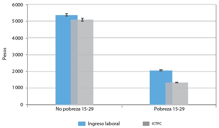 Independientemente de las prácticas culturales, la emancipación no parece ser una opción económicamente accesible para la juventud mexicana, considerando que alrededor de la mitad de los jóvenes que no son jefes de familia tienen ingresos laborales por debajo de la línea de pobreza. Por otro lado, permanecer en el hogar de origen tiene costos económicos que podrían representar un obstáculo adicional a la emancipación. El ingreso laboral promedio de los jóvenes que no se encuentran en pobreza es prácticamente igual a su ingreso corriente total per cápita,11lo que indica que no hay pérdidas asociadas a quedarse en casa de los padres. Por el contrario, entre los jóvenes en pobreza que trabajan, el ingreso laboral promedio es considerablemente mayor al ingreso corriente total per cápita: los jóvenes en pobreza reciben 66 por ciento de lo que aportan a la unidad doméstica, mientras que los no pobres reciben 97 por ciento. Esto sugiere que los jóvenes en pobreza se beneficiarían si se emanciparan. Sin embargo, el monto del ingreso laboral promedio es de 2 042 pesos mensuales (5 397 entre los no pobres), que no alcanza para cubrir los gastos de una vivienda.