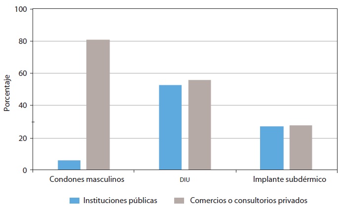 Tener hijos es probablemente la transición más riesgosa tanto para los jóvenes como para la transmisión intergeneracional de las condiciones de pobreza. En este sentido, la planificación familiar se vuelve muy relevante, pero en México la salud y la educación sexual y reproductiva reciben una atención marginal y rara vez están específicamente diseñadas para los jóvenes, que deberían considerarse un grupo de usuarios particularmente importante. Uno de los temas centrales en este ámbito es la anticoncepción y la Encuesta Nacional de la Dinámica Demográfica (Enadid)12 muestra que existen vacíos en las políticas y servicios del Estado que obstaculizan la posibilidad de los jóvenes de controlar su vida sexual y acceder a los servicios especializados. Por ejemplo, aunque la provisión de métodos anticonceptivos es parte de los servicios de salud públicos, no parece cubrir las necesidades de las mujeres jóvenes. Entre las que ya iniciaron su vida sexual, 19 por ciento nunca ha utilizado un método anticonceptivo, cifra que resulta alarmante tanto por el riesgo de transmisión de enfermedades como por la falta de agencia en el embarazo. Entre aquellas que reportaron haber tenido relaciones sexuales en el último mes, el método anticonceptivo más popular son los condones (40%), seguido del DIU (26%) y los implantes subdérmicos (13%). Aunque los primeros se distribuyen a través de diferentes instituciones públicas, la ma yoría de las jóvenes o sus parejas los obtienen en farmacias o tiendas de autoservicio, lo cual indica que hay un problema en las políticas de distribución, en la accesibilidad de los servicios o en la confianza en la calidad de los anticonceptivos que se distribuyen, por mencionar solo algunas posibilidades. Los otros dos métodos se obtienen a partes casi iguales en el sistema público y el privado, lo que habla de las limitaciones de la cobertura de los servicios del Estado (gráfica 5).