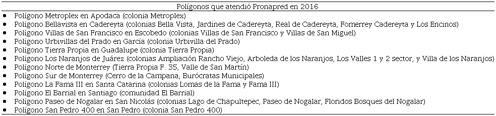 En el caso de Nuevo León, el Pronapred para 2016 debía contemplar acciones en 12 polígonos de atención prioritaria distribuidos en 11 municipios de la zona metropolitana de Monterrey (DOF, 2016).