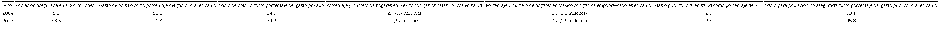A partir de un análisis econométrico con datos de la Encuesta Nacional de Ingresos y Gasto de los Hogares (ENIGH) de 2004 a 2012, Knaul et al. (2018) demostraron que el SP tuvo un efecto significativo en reducir la probabilidad de sufrir gastos empobrecedores entre sus afiliados; sin embargo, los resultados también sugieren que el programa no demostró un impacto notable en la reducción del gasto de bolsillo de los hogares mexicanos, ni tampoco existió una diferencia significativa en la disminución de los gastos catastróficos y empobrecedores entre los afiliados y no afiliados al SP. Por su parte, Ávila et al. (2013) encontraron, con datos de la Encuesta Nacional de Salud y Nutrición (Ensanut, 2012), que el SP tuvo efectos positivos sobre los gastos catastróficos y los gastos de bolsillo en las familias afiliadas al programa, principalmente en hogares con necesidades de salud.