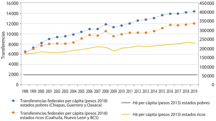 En ese año, el último para el cual tenemos información, Nuevo León transfirió al gobierno federal -al neto de las transferencias recibidas- una cuarta parte de su PIBE, y eso es equivalente a las transferencias recibidas por Chiapas y Oaxaca en el mismo año, al neto de los impuestos devengados al gobierno federal. Esa transferencia neta ha sido superior, en 2018, al entero valor del PIBE del estado de Chiapas.