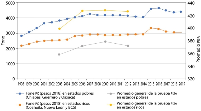 La gráfica 2 muestra la evolución del Fone per cápita entre los tres ricos y los tres pobres, y los resultados de la prueba PISA (Programme for International Student Assessment), con la cual se evalúa la calidad del sistema educativo público entre los estudiantes con 15 años de edad.