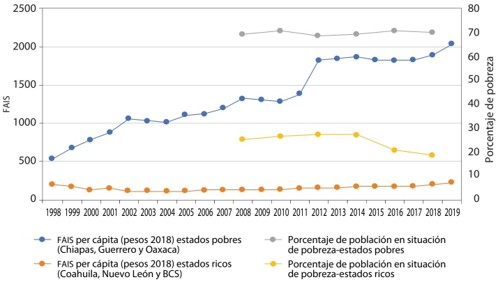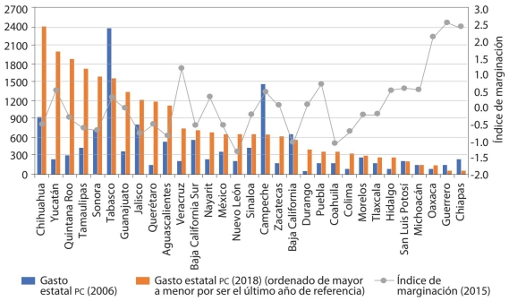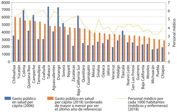 En un primer análisis, Merino (2003) indica que, en los años posteriores a la descentralización, no existía una relación entre las entidades con mayores índices de pobreza (medida por el índice de marginación elaborado por el Consejo Nacional de Población [Conapo]) y el gasto per cápita en salud que ejercían los gobiernos estatales. Las entidades del sureste mexicano recibían menos recursos financieros que los estados del norte y centro del país.