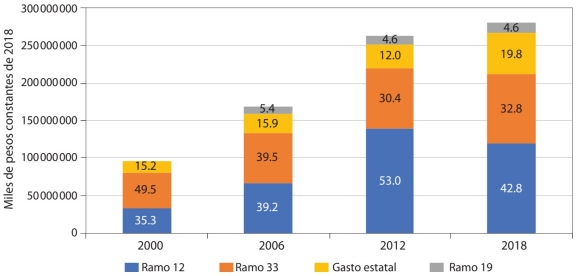 El financiamiento de los servicios de salud para la población sin seguridad social proviene de cuatro fuentes: ramo 12 (Seguro Popular), ramo 33 (Fassa), ramo 19 (IMSS-Bienestar) y del gasto estatal.10 Las dos primeras fuentes de ingresos y la contribución de los estados son administradas por los gobiernos estatales y el ramo 19 es ejercido por el IMSS.