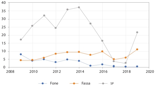 Para corroborar esta afirmación, el órgano fiscalizador elabora el indicador monto observado (irregularidades en el manejo de los recursos) respecto a la muestra auditada que ayuda a evaluar la calidad de la gestión de los recursos. Si comparamos este indicador de las cuentas públicas entre 2009 y 2019, el Fone muestra una tendencia descendente posterior a la recentralización en comparación del Fassa y el programa SP (gráfica 7).