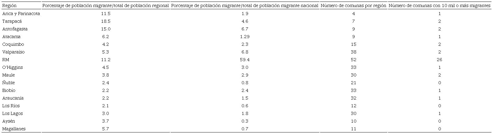 En Chile, 59.4 por ciento del total de la población migrante reside en la Región Metropolitana, 6.8 por ciento lo hace en la región de Valparaíso, 6.7 por ciento en la de Antofagasta, y 4.6 por ciento en la de Tarapacá. Es decir, 77.5 por ciento de los extranjeros vive en cuatro de las 16 regiones chilenas, lo que configura un eje de alta concentración entre las zonas centro y norte del país.