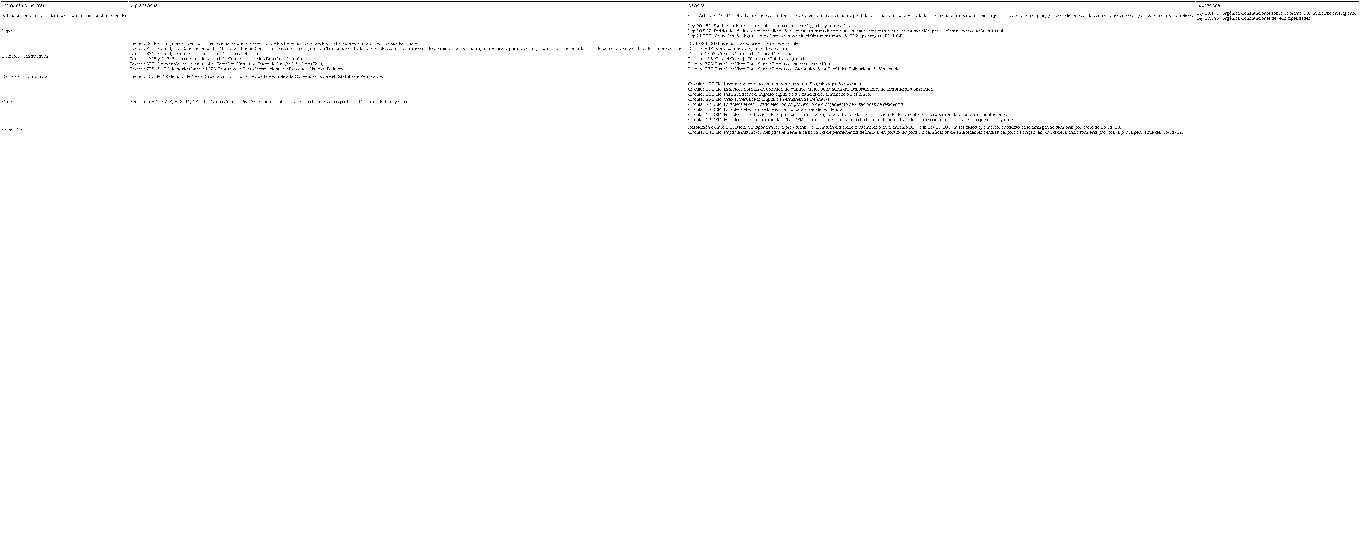 El cuadro 2 contiene todos los instrumentos que ha suscrito Chile en materia migratoria a marzo de 2021, incluidos los correspondientes al nivel supranacional, donde destacan la Convención sobre el Estatuto de Refugiados de 1951 y su Protocolo de 1967, que consagran la figura jurídica del refugio. Ambo textos consideran al refugiado como toda persona que, por fundados temores de persecución racial, religiosa, política o de nacionalidad, se halle fuera de su país de origen o de su residencia habitual.
